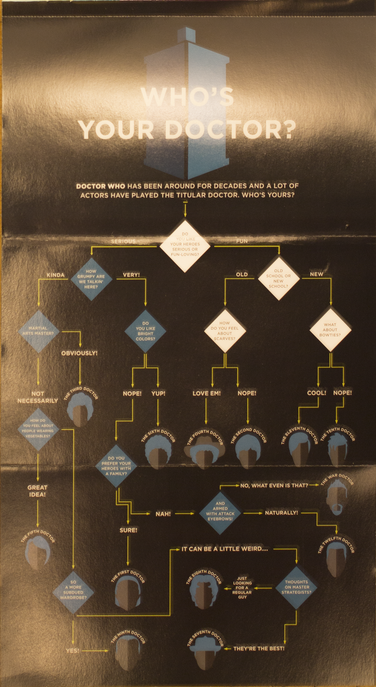 Ja vihko jossa on kuvaus tuotteille sekä poikkeukselliseti keskiaukeamalla auki taiteltava sivu jonka toisella puolella on BttF rekisterikilpi ja toisella puolella Dr. Who – whose your Doctor -juliste